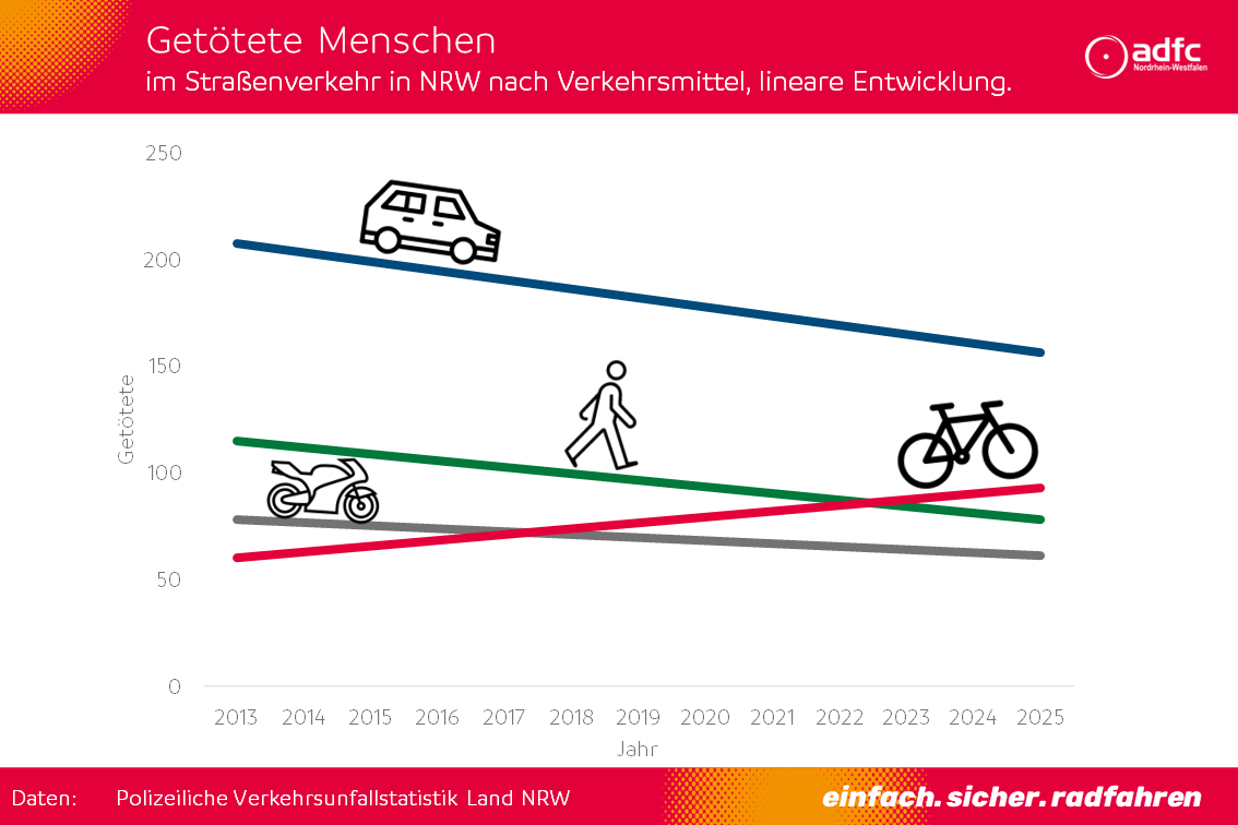 Nordrhein-Westfalen steht verkehrspolitisch an einem Wendepunkt. In der Vergangenheit konnten in NRW bei der Verkehrssicherheit Erfolge erzielt werden. So ist trotz mehr zugelassener Pkw und mehr Autoverkehr die Zahl verunglückter Pkw-Insassen gesunken. Die Zahl der verunfallten Radfahrenden ist in den vergangenen Jahren allerdings gestiegen. Statistisch gesehen wurden im Jahr 2025 zwei Radfahrende in NRW im Straßenverkehr wöchentlich getötet. Der dramatische Anstieg der Unfallzahlen von Radfahrenden ist äußerst besorgniserregend und signalisiert akuten Handlungsbedarf, damit eine Entkoppelung der Unfallentwicklung vom Verkehrsaufkommen auch beim Radverkehr gelingt.