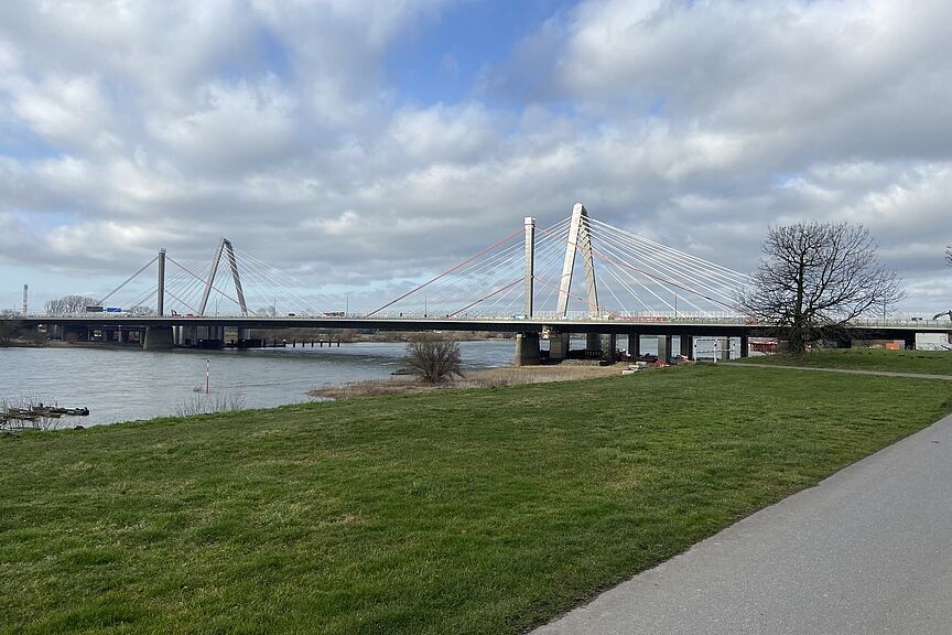 Nachdem die neue Teilbrücke über den Rhein am 4. Februar 2024 eröffnet wurde, ist der Geh- und Radweg auf der Nordseite nutzbar. Mit einer Breite von 3,25 Meter ist ein entspanntes Radfahren garantiert.