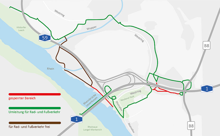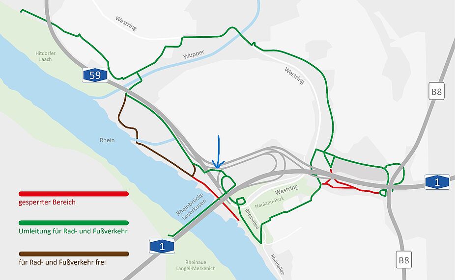 Seit dem 04.10.2021 ist der Rheinradweg zwischen Leverkusen-Rheindorf und Leverkusen-Wiesdorf für Fußgänger und Radfahrer gesperrt. Die Schiffsbrücke an der alten Wuppermündung ist über die Pontonbrücke von Rheindorf aus wieder erreichbar.